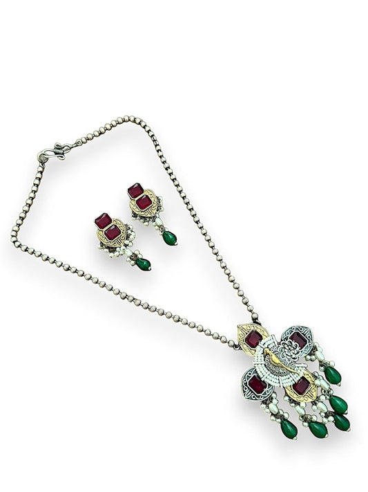 Peacock Elegance Oxidized Necklace Set with Ruby and Emerald Accents