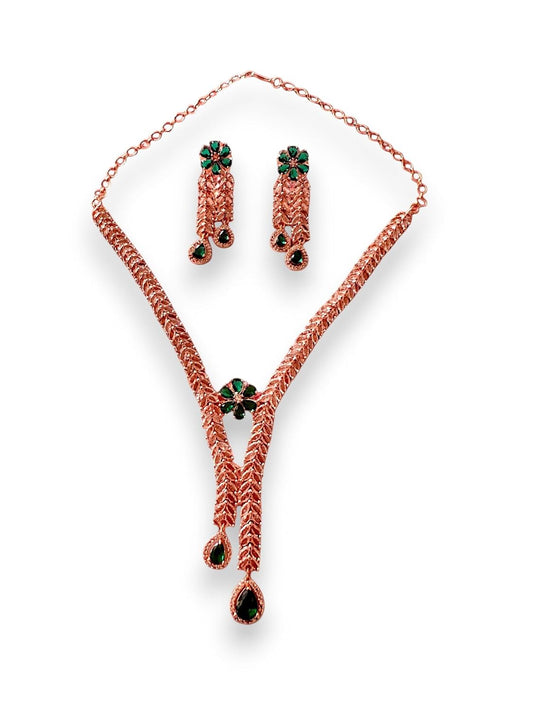 Rebekah Gold-Plated CZ Necklace Set with Floral Green Accents and Tear-Drop Danglers