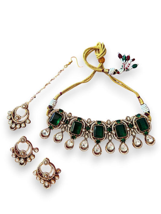 Rebekah Emerald Elegance Kundan Encrusted Bridal Choker Set with Maangtika