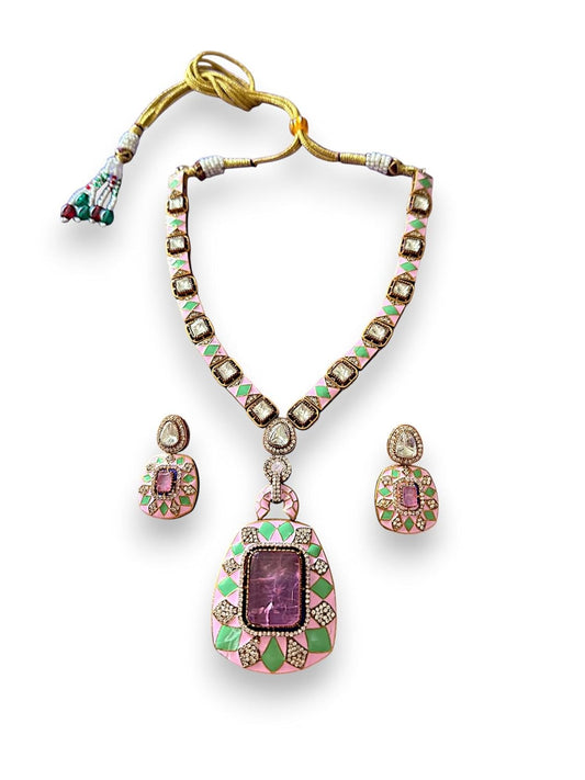Pastel Pink Majesty Meenakari Long Pendant Set