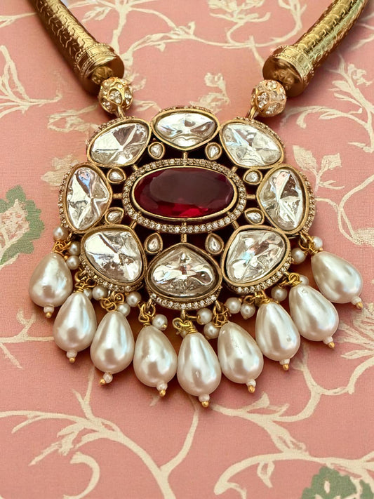 Regal Kundan Hasli Necklace Set with Ruby Red Centerpiece and Pearl Drop Accents