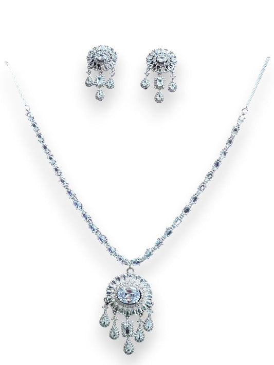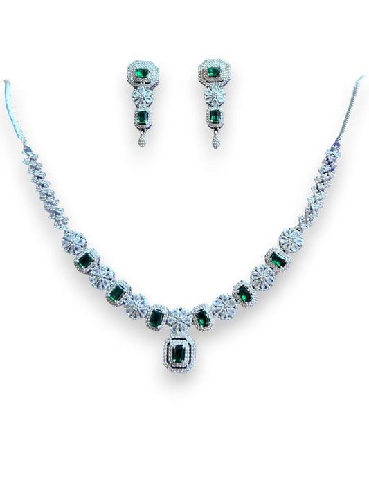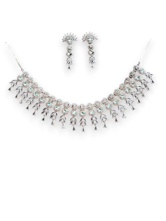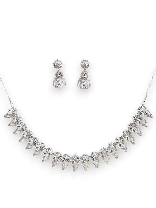 Cubic Zirconia Necklace Set with Leaf Design, 50 cm Chain, Silver Tone