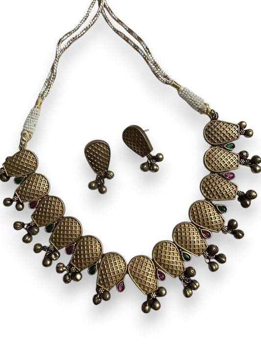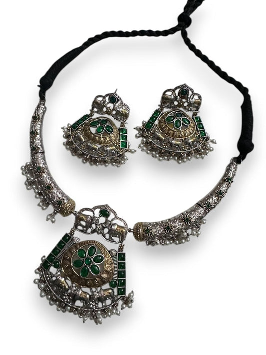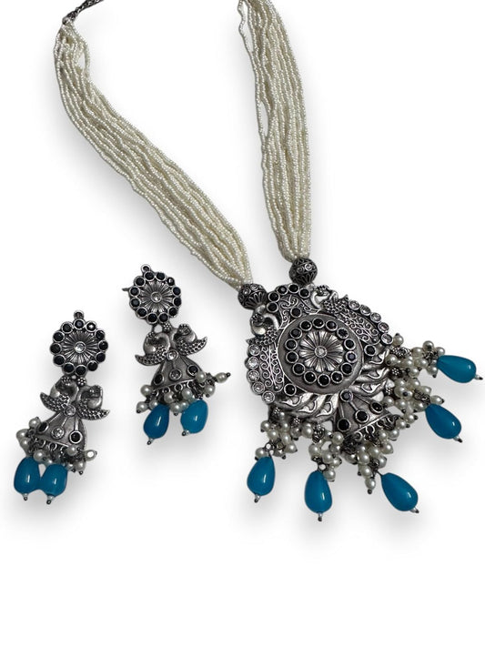 Antique Silver Pendant Necklace Set, Blue Teardrop Beads, Pearl Strings, Oxidised Floral Design