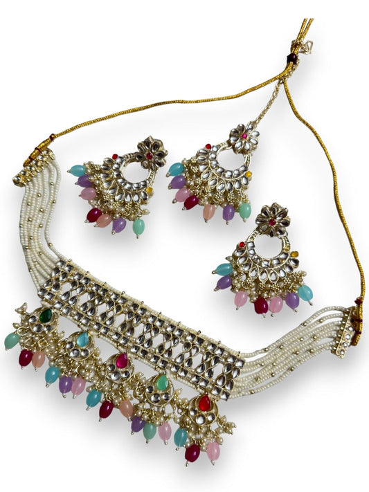 Elegant Pearl and Gemstone Necklace Set with Earrings, Rhodium Plated