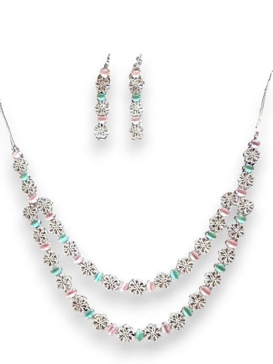 Elegant Layered Necklace and Earrings Set, Silver Tone with Crystals, Pink and Green Beads,