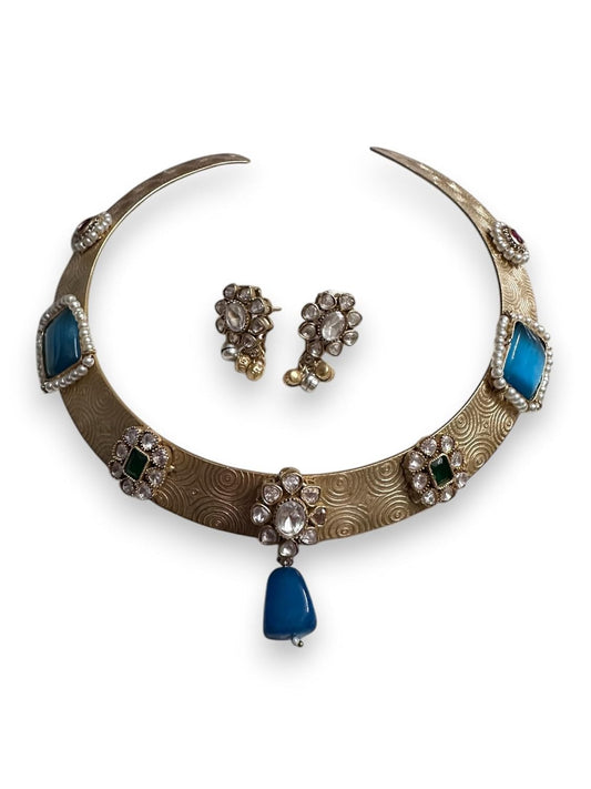 Vintage Style Choker Necklace Set with Crystal Stones, Blue Gemstones, Pearl Accents