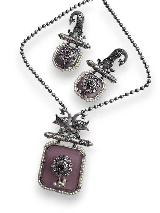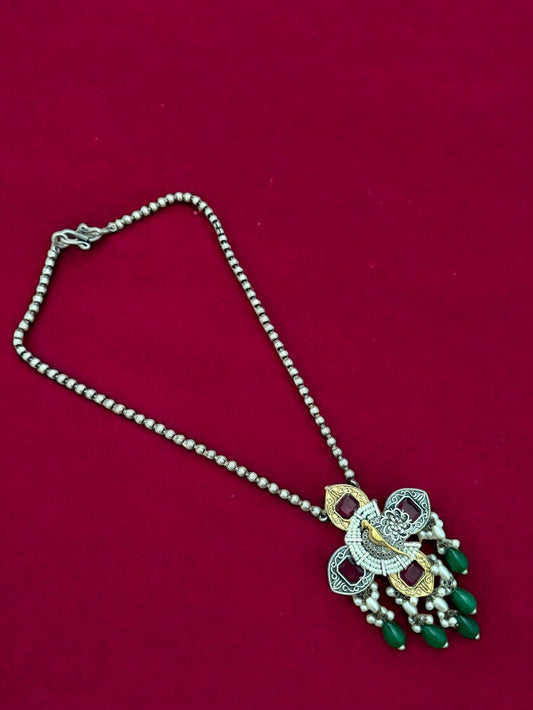 Peacock Elegance Oxidized Necklace Set with Ruby and Emerald Accents