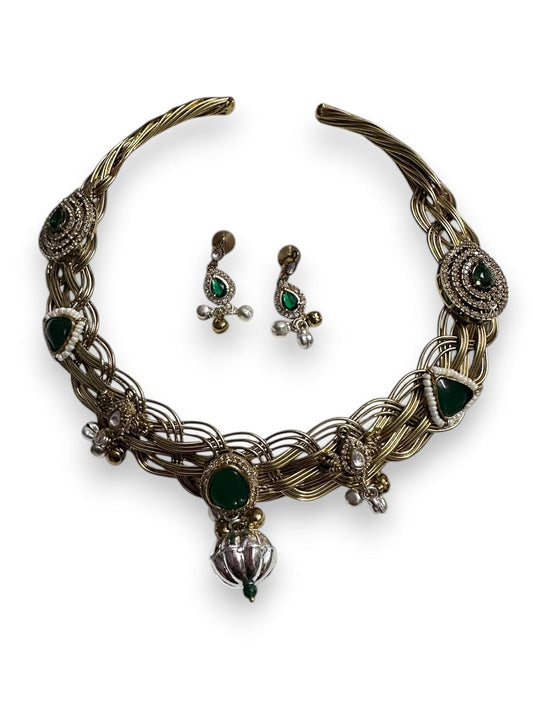 Vintage Style Choker Necklace and Earring Set, Green Gemstones, Crystal Accents