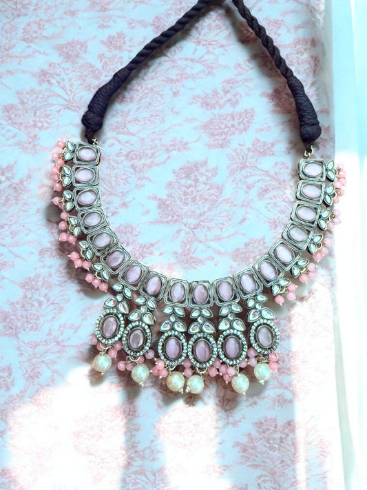 Pastel Pink Kundan Antique Necklace Set with Pearl Drops