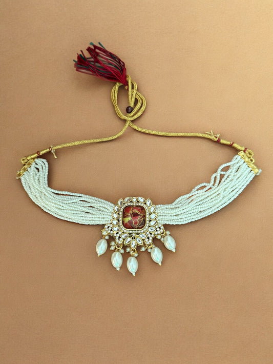 Red Fire Stone Studded Multi Strand Pearl Kundan Choker Necklace Set with Matching Jhumkas