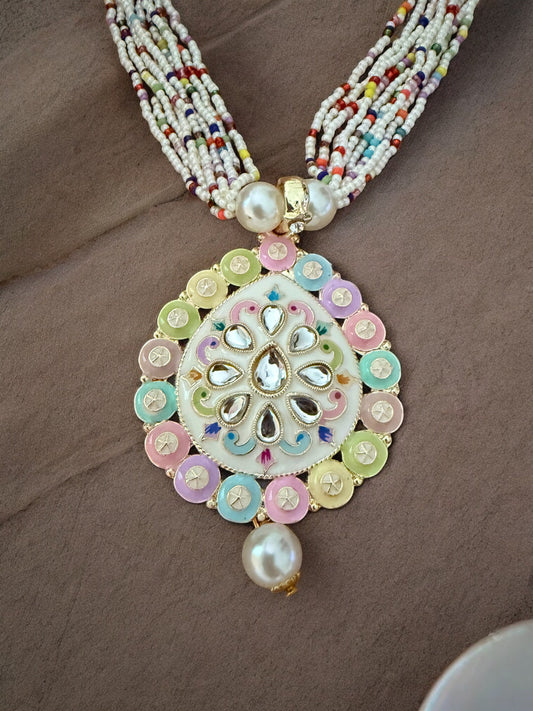 Multicolor Beaded Necklace Set Handpainted Kundan Pendant and Pearl Drop Earrings