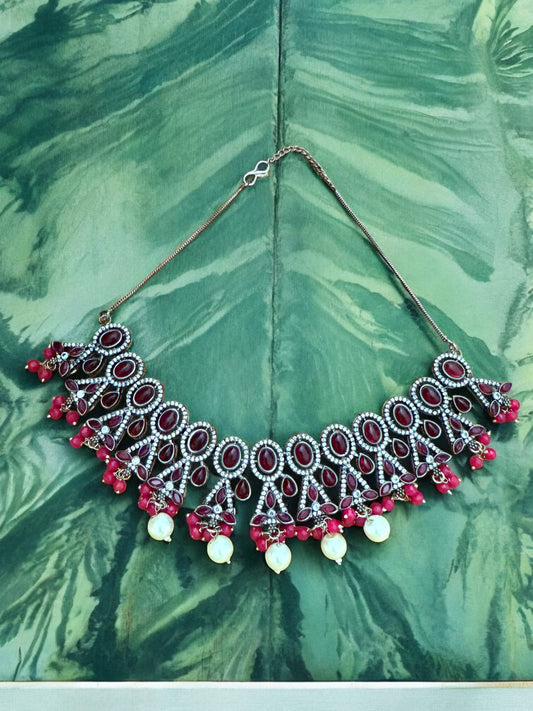 Maroon Oval and Teardrop Stone Necklace Set with Pink Beads and Pearl Drops