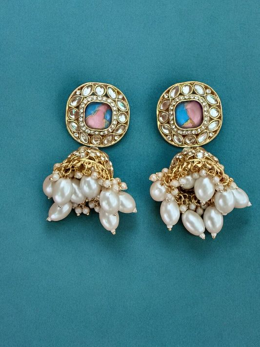 Pastel Pink Fire Stone Studded Multi Strand Pearl Kundan Choker Necklace Set with Matching Jhumkas