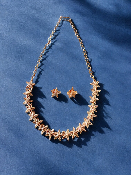 Gold-Toned Floral Necklace Set with Stone-Studded Detailing & Matching Stud Earrings – Festive Elegance Redefined