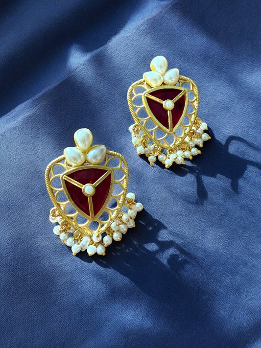Crimson Red Lotus Shield Earrings with Pearl Beads