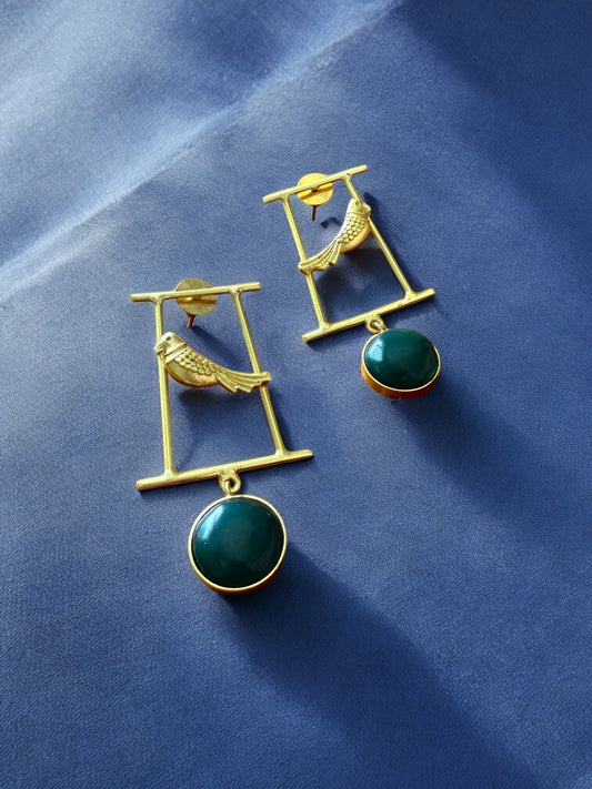 Artisanal Gold Bird Motif and Green Gem Earrings