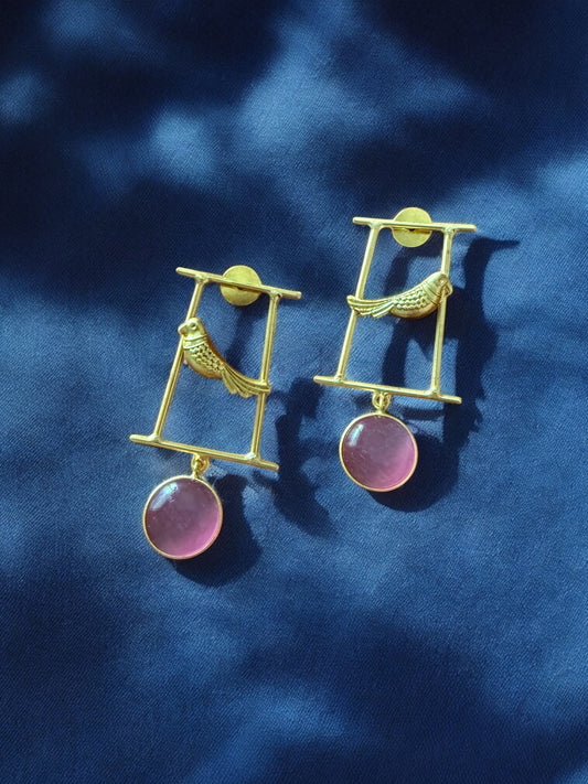 Artisanal Gold Bird Motif and Pink Gem Earrings