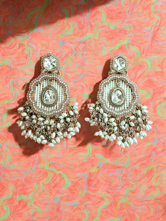 Dusty Rose Dangling Kundan Earrings with Intricate Beadwork & Pearl Detailing