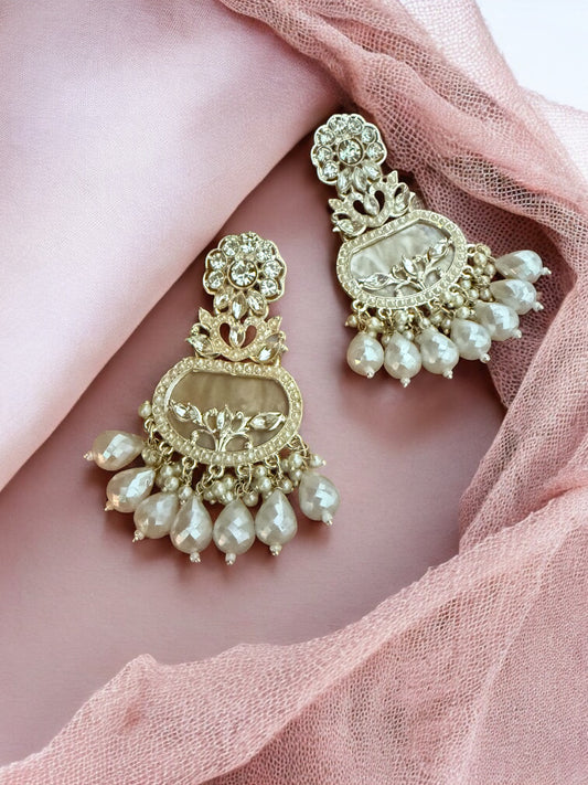 Crystal Cream Floral Motif Earrings with Filigree Details and Pearl Beads Accents