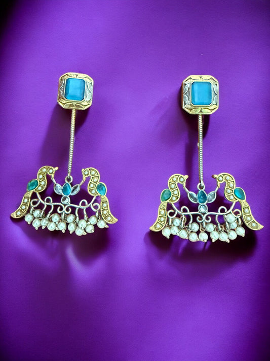 Antique Gold Silver Toned Earrings With Blue Stone Studs, Bird Motif And Pearl Bead Drops