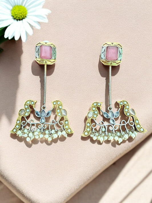 Antique Gold Silver Toned Earrings With Pink Stone Studs, Bird Motif And Pearl Bead Drops