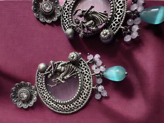 German Silver Green Moon Stone Earring with Radhe Krishna Motif Alloy Drops & Danglers