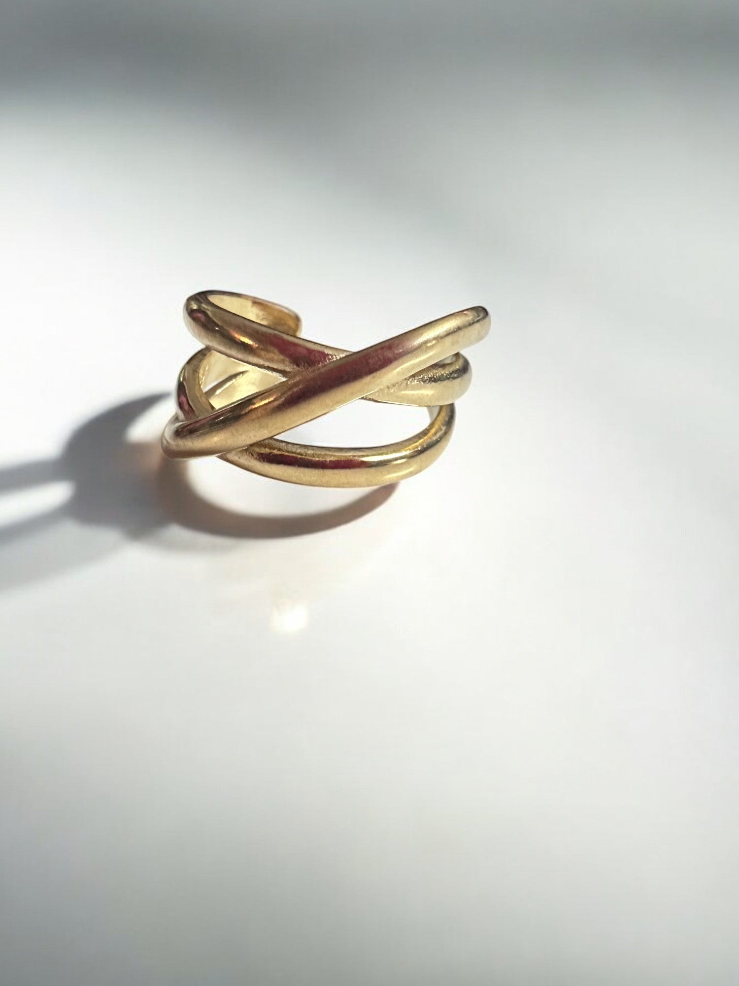 This striking gold ring features an intricate twisted design that exudes sophistication and strength. With its open-ended structure and sculptural curves, this piece offers a perfect balance of modernity and timeless elegance. Ideal for those who appreciate bold statement jewelry, this ring effortlessly enhances any outfit, making it a must-have addition to your collection