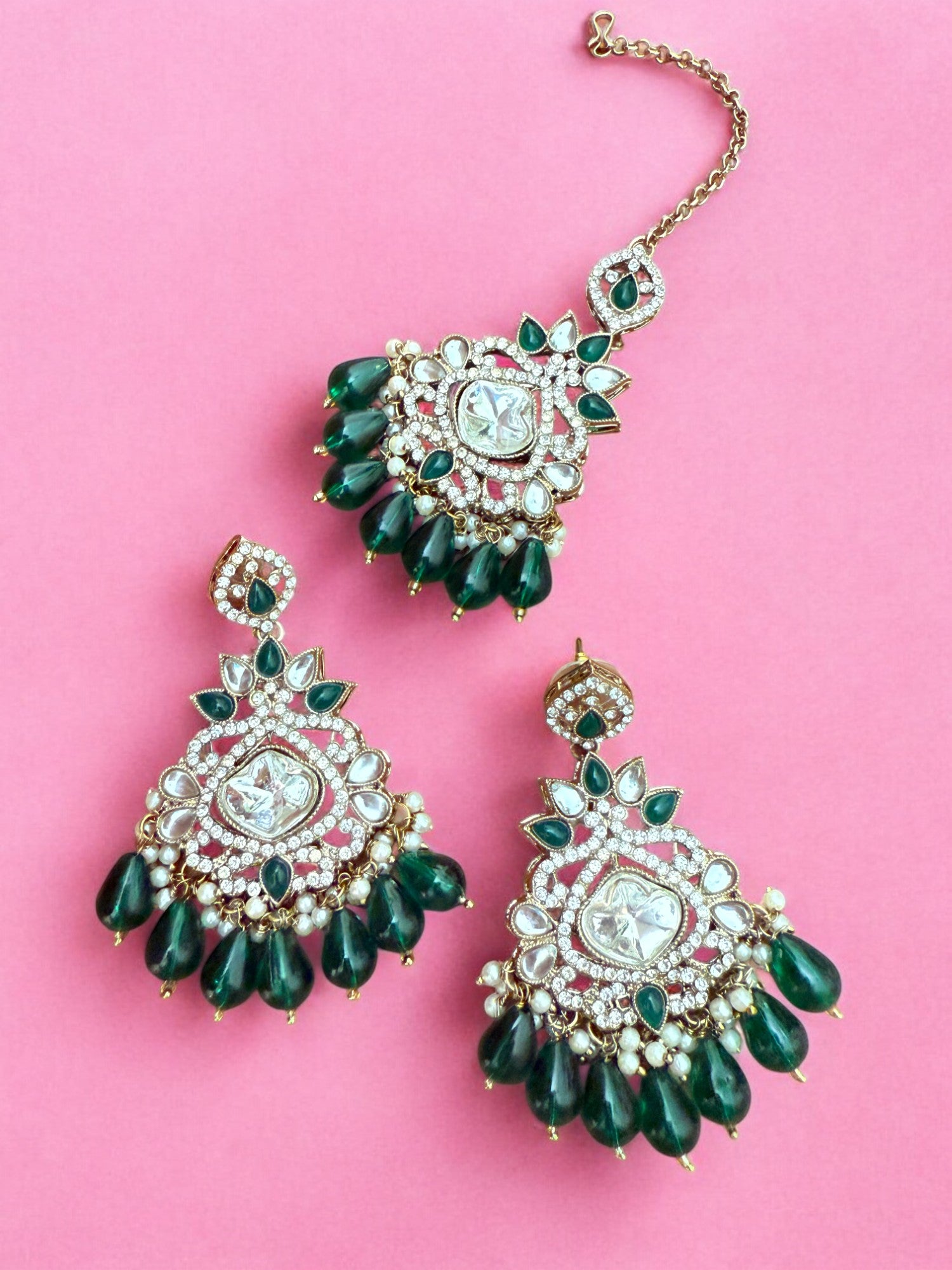 Bridal Green Stone Polki Choker with Earrings & Maangtikka