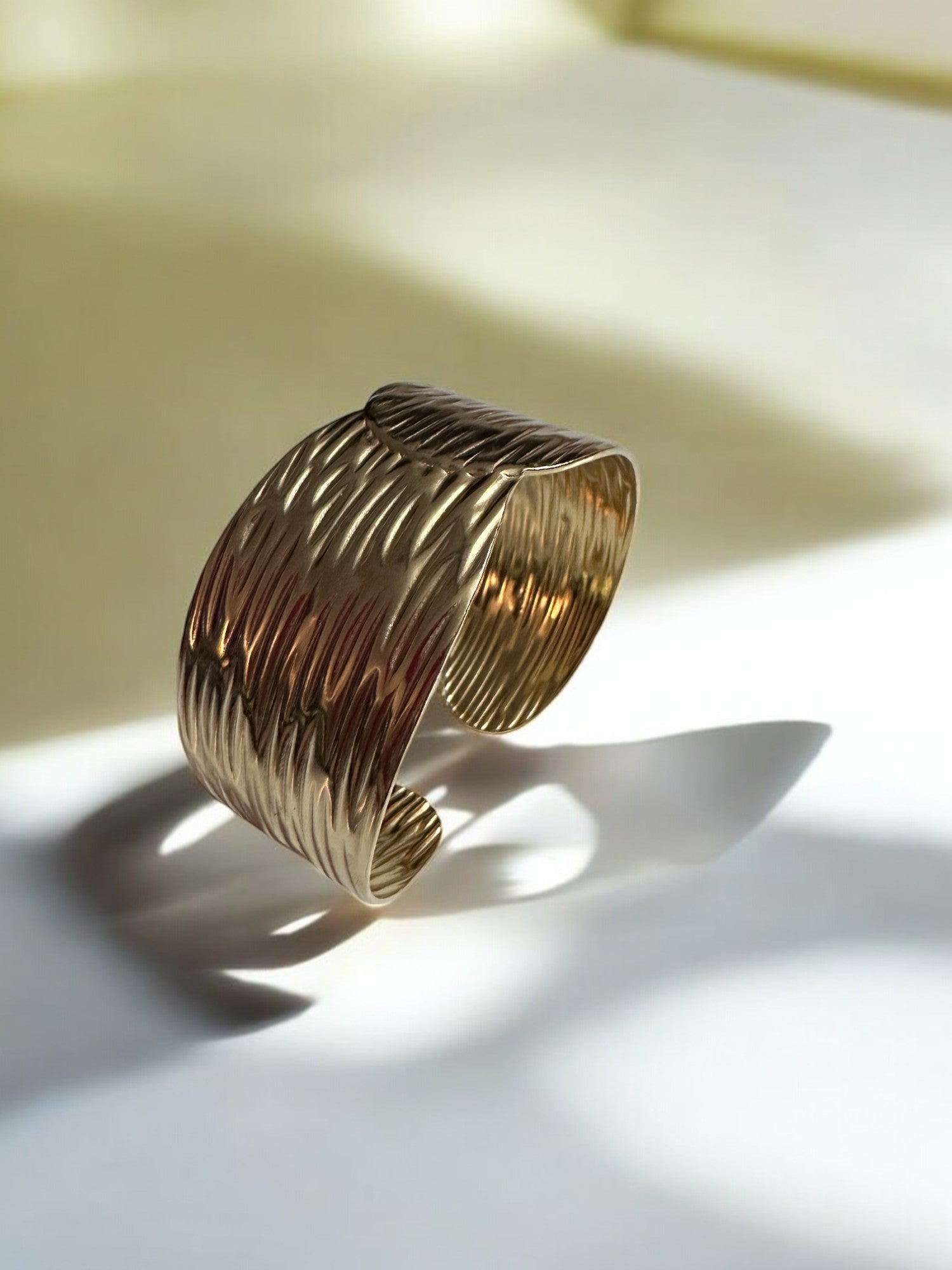 This striking gold cuff bracelet features a bold, textured surface with intricate engravings, creating a dynamic interplay of light and shadow. Its wide, sculptural form adds a contemporary touch, making it a statement accessory for any occasion. The soft, warm lighting enhances its luxurious appeal, highlighting the craftsmanship and unique design.
