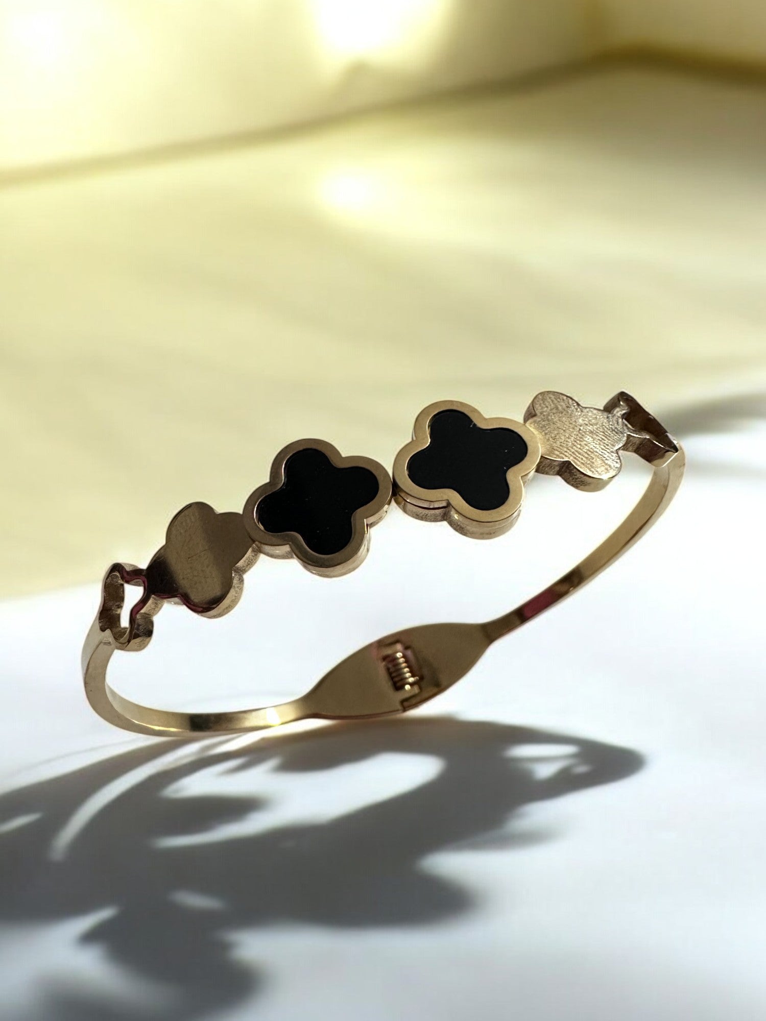 This sophisticated gold bracelet features a delicate clover-shaped design, with alternating polished and matte textures. The black inlays add a striking contrast, enhancing its luxurious appeal. The soft lighting and artistic shadows emphasize its refined craftsmanship, making it a perfect statement piece