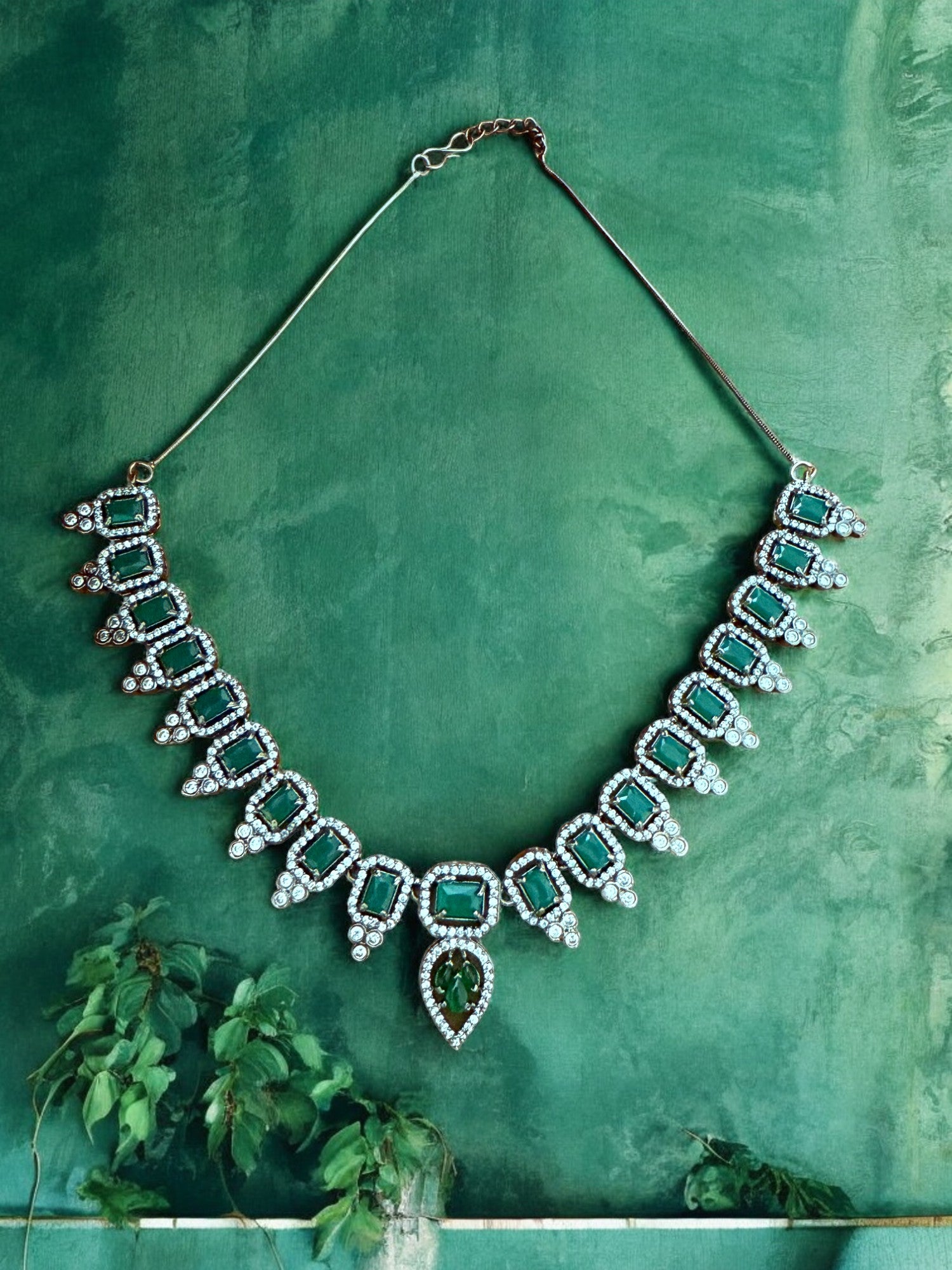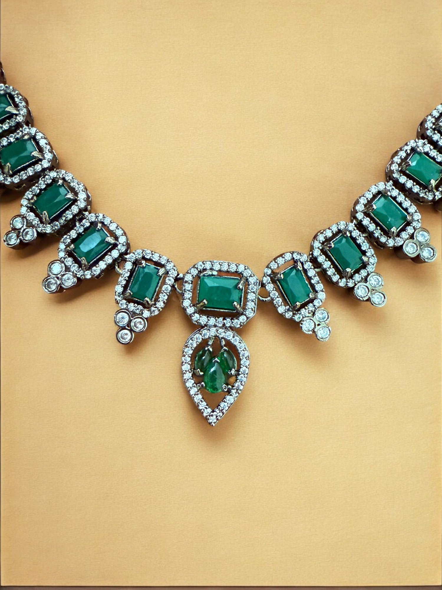 Emerald Green Necklace Set with Rectangular and Teardrop Stones Accented in Silver-Tone American Diamonds