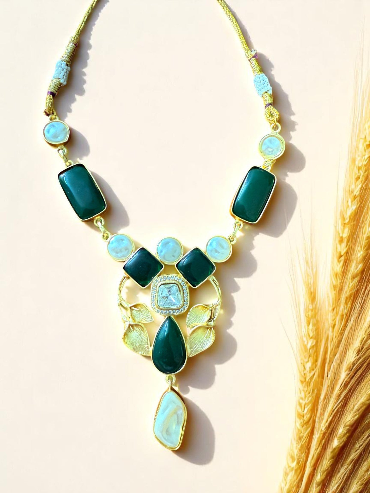 Emerald Green Petal Necklace Set with Green Onyx and Mother of Pearl