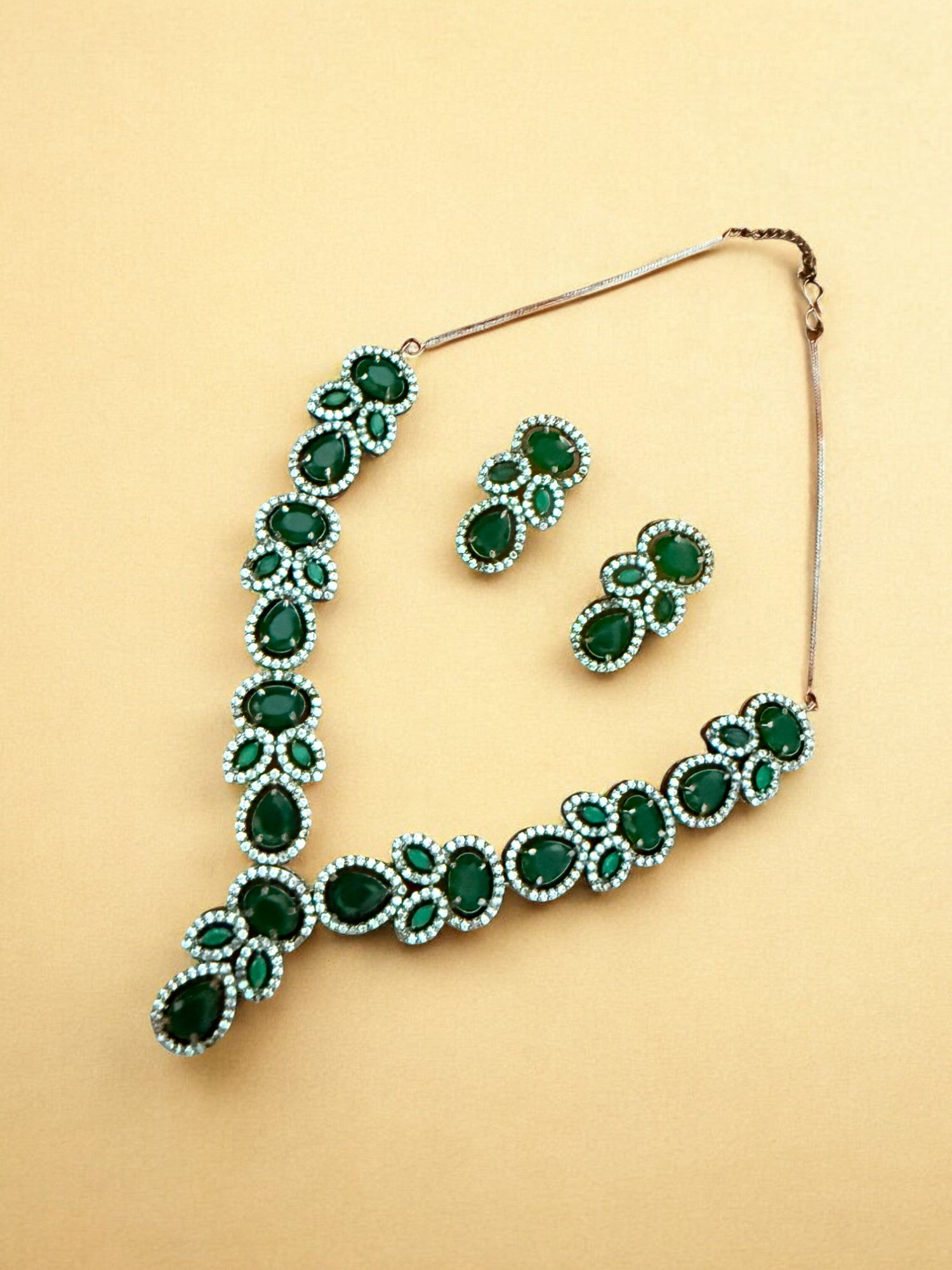 Green Silver-Tone Necklace Set with Teardrop & Oval Crystal Stones and American Diamonds