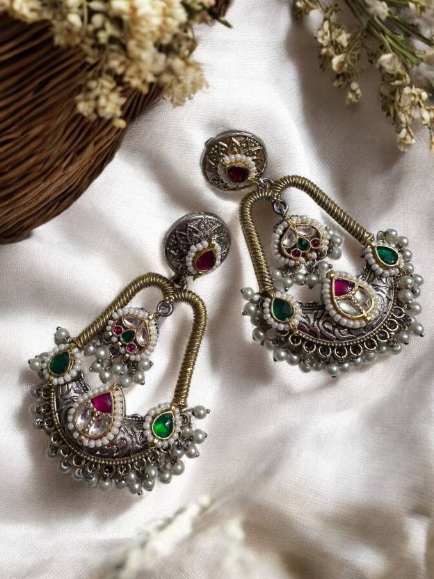 Elevate your traditional ensemble with these exquisite handcrafted earrings that showcase the finest artisanal craftsmanship. These stunning pieces feature an intricate design adorned with lustrous pearls, emerald-hued stones, and vibrant coloured gems set in a dual-tone metallic framework. The earrings boast a graceful chandelier silhouette with delicate filigree work and spiral detailing. Each piece is meticulously detailed with pearl clusters around the edges, creating a sophisticated border that catches light beautifully. The combination of stones adds a royal touch, while the antique finish gives these earrings a timeless appeal. Perfect for special occasions, festivals, or traditional ceremonies, these statement pieces will add glamour to any ethnic outfit. The secure fastening ensures comfortable wear throughout your events.