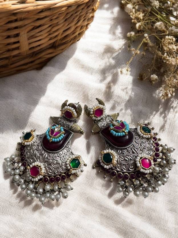 Elevate your traditional ensemble with these exquisite handcrafted earrings that showcase the finest artisanal craftsmanship. These stunning pieces feature an intricate design adorned with lustrous pearls, emerald-hued stones, and vibrant coloured gems set in a dual-tone metallic framework. The earrings boast a graceful chandelier silhouette with delicate filigree work and spiral detailing. Each piece is meticulously detailed with pearl clusters around the edges, creating a sophisticated border that catches light beautifully. The combination of stones adds a royal touch, while the antique finish gives these earrings a timeless appeal. Perfect for special occasions, festivals, or traditional ceremonies, these statement pieces will add glamour to any ethnic outfit. The secure fastening ensures comfortable wear throughout your events.