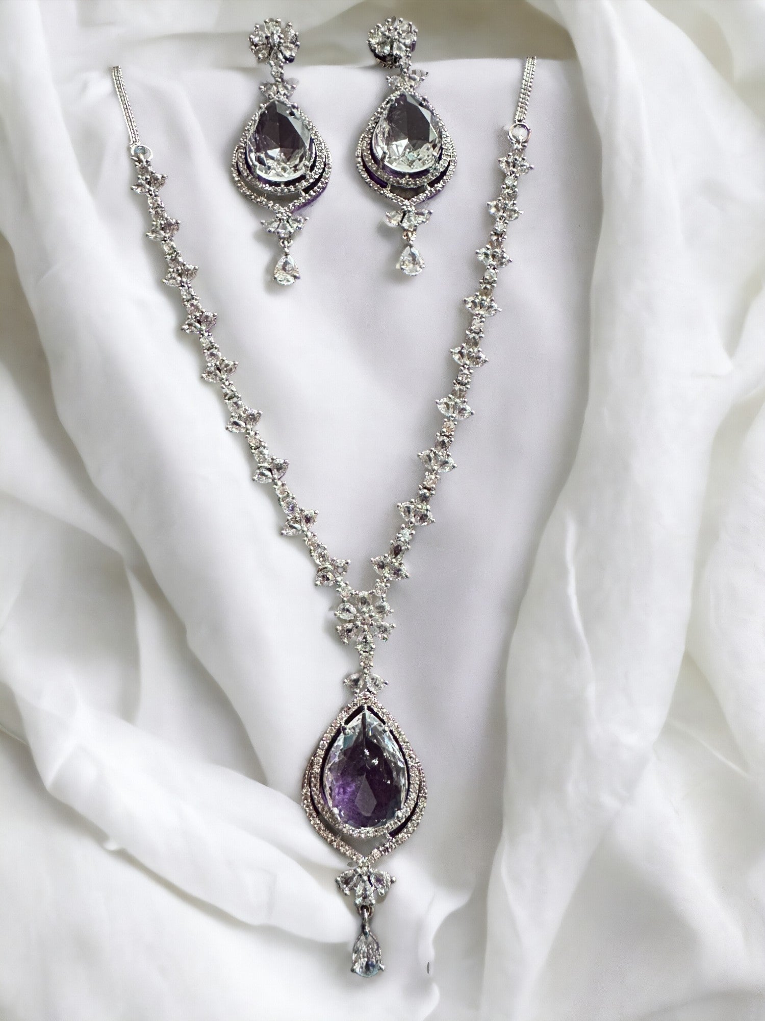 Elevate your style with this exquisite jewellery set featuring a necklace and matching earrings. Crafted with meticulous attention to detail, the set showcases a stunning array of sparkling crystals in a mesmerising colour & the depths. Each piece is elegantly designed with intricate metalwork, creating a captivating play of light and shadow. The necklace gracefully drapes around the neck, while the dazzling earrings add a touch of radiance to your look. Whether for a special occasion or an everyday ensemble, this jewellery set is sure to turn heads and leave a lasting impression. Indulge in its timeless beauty and elevate your confidence with every wear.