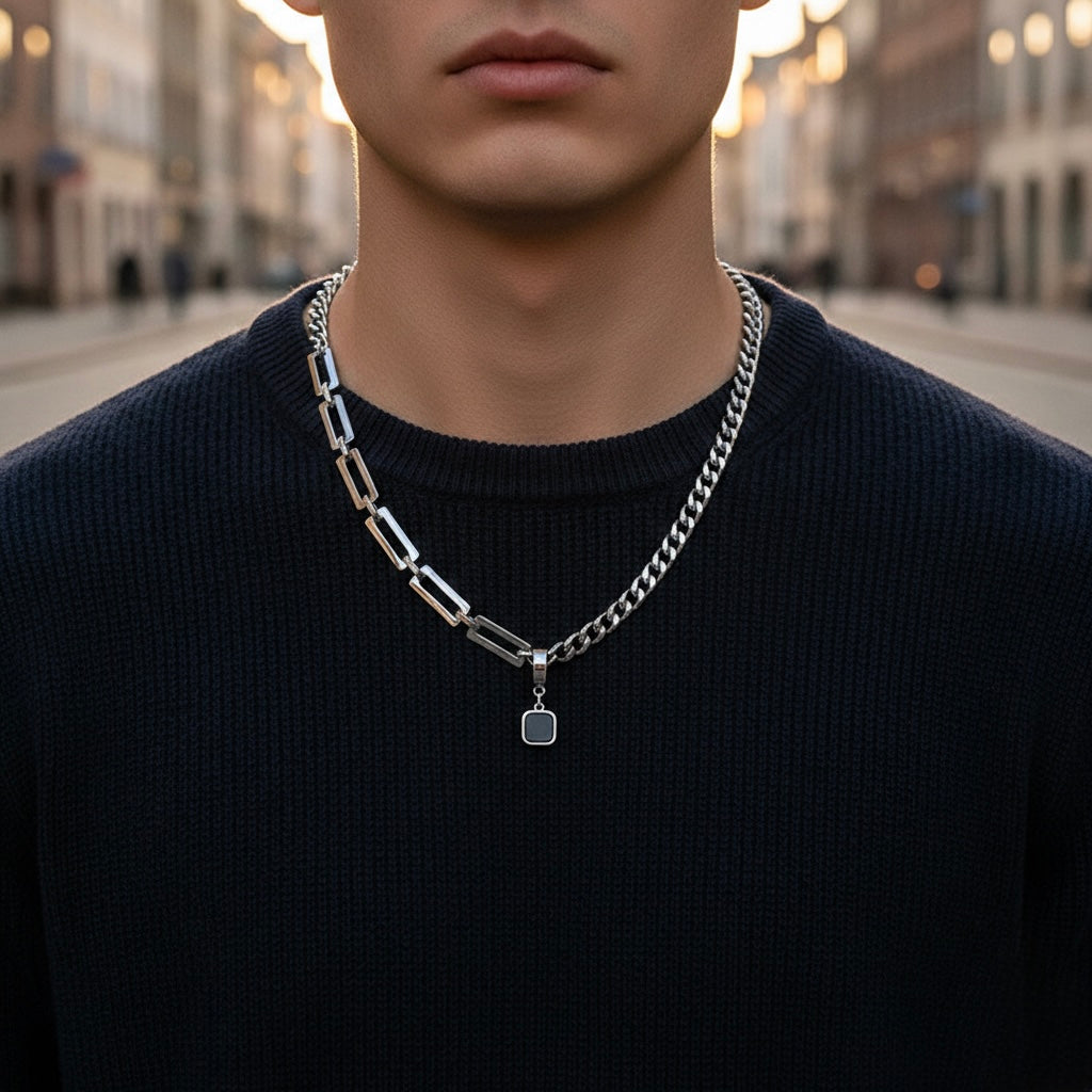 Men Silver Toned asymmetric chain featuring a bold black square Pendant
