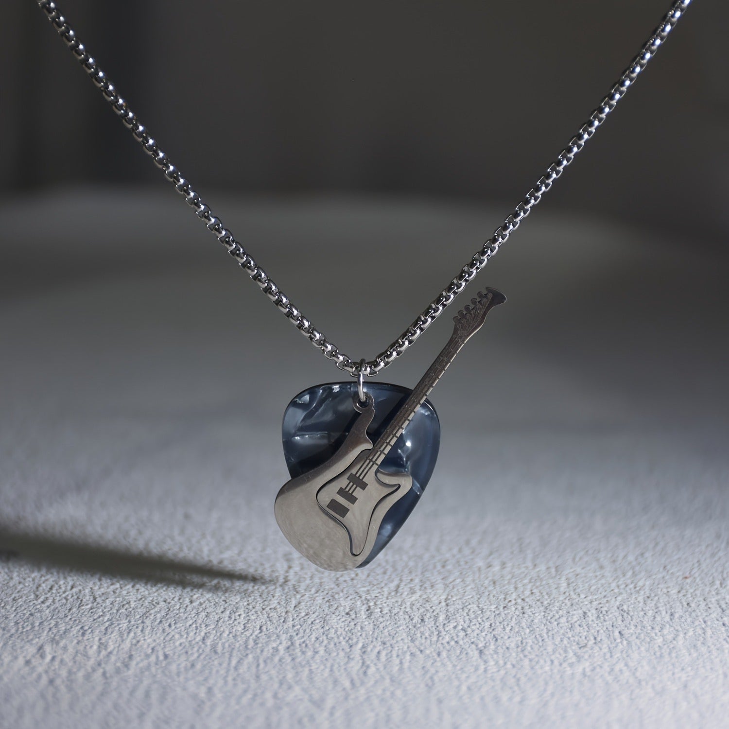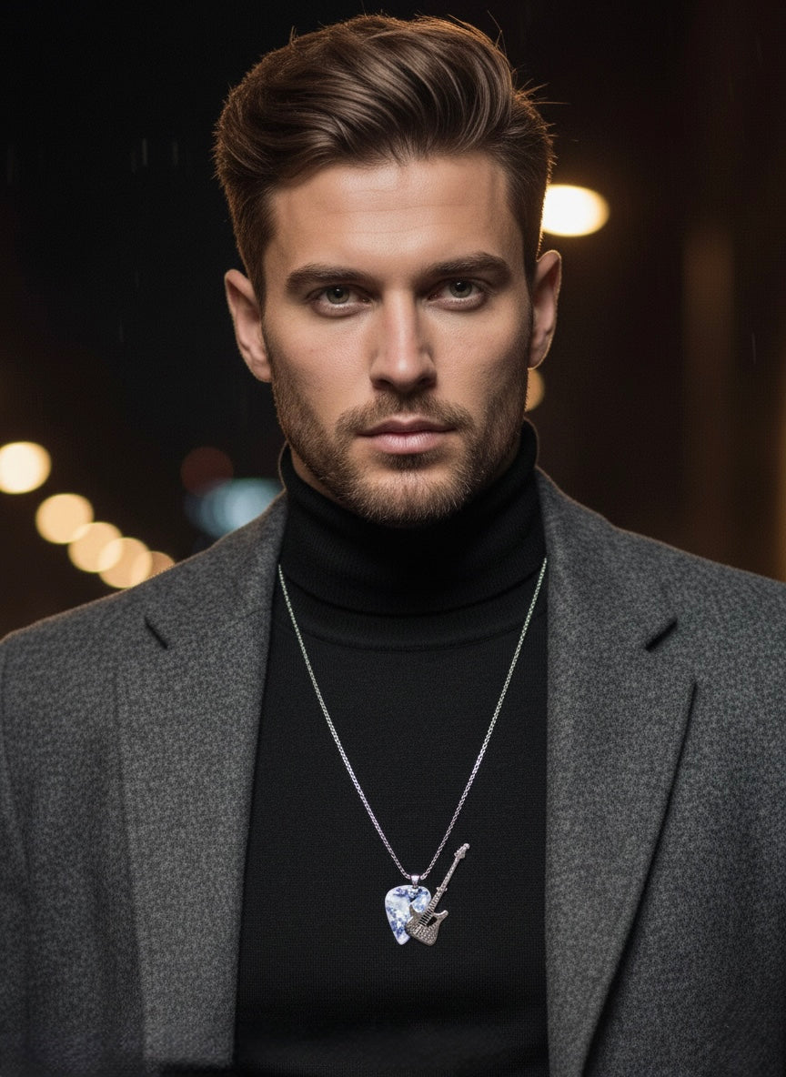 Men Silver Toned Boxed Chain with Guitar & Marbled Pendant