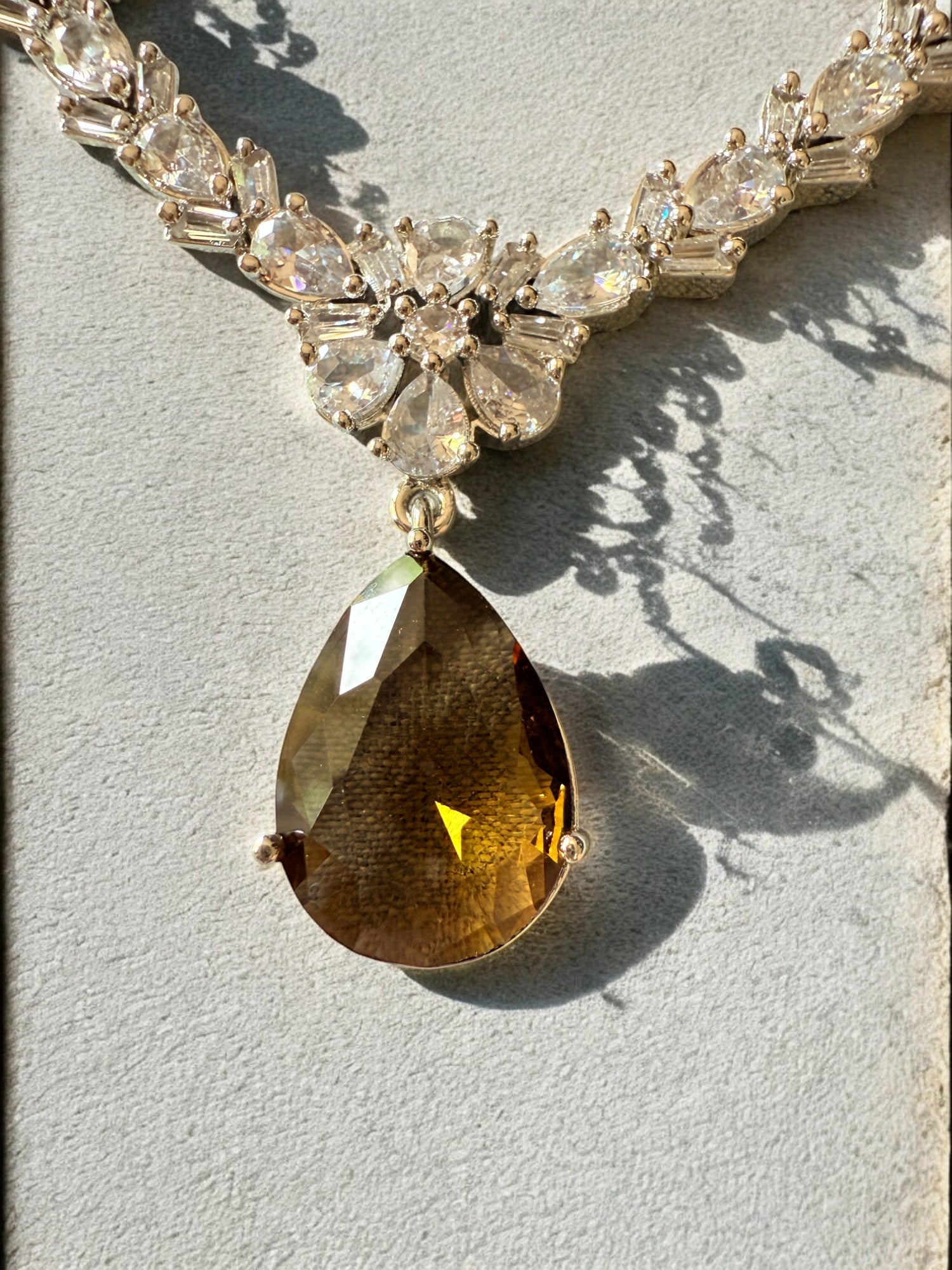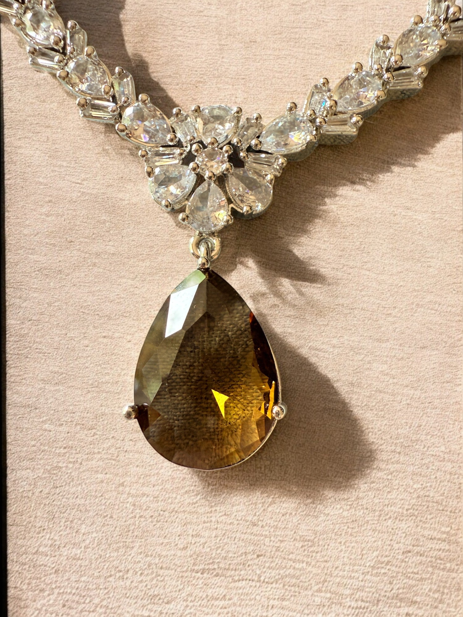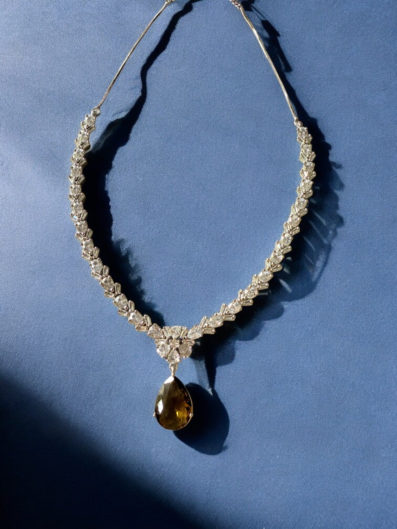 Elevate your style with this exquisite jewellery set featuring a necklace and matching earrings. Crafted with meticulous attention to detail, the set showcases a stunning array of sparkling crystals in a mesmerising colour & the depths. Each piece is elegantly designed with intricate metalwork, creating a captivating play of light and shadow. The necklace gracefully drapes around the neck, while the dazzling earrings add a touch of radiance to your look. Whether for a special occasion or an everyday ensemble, this jewellery set is sure to turn heads and leave a lasting impression. Indulge in its timeless beauty and elevate your confidence with every wear.