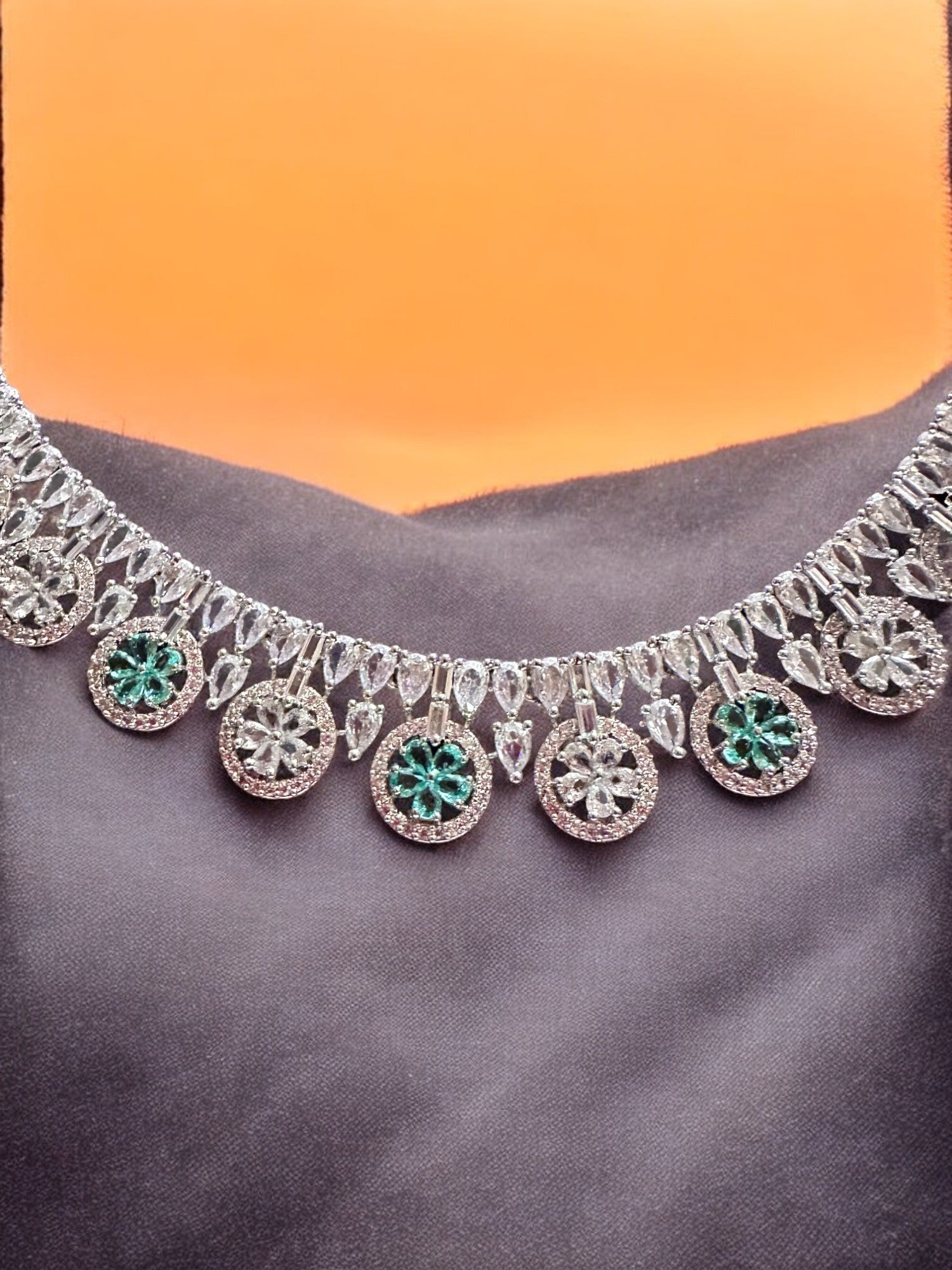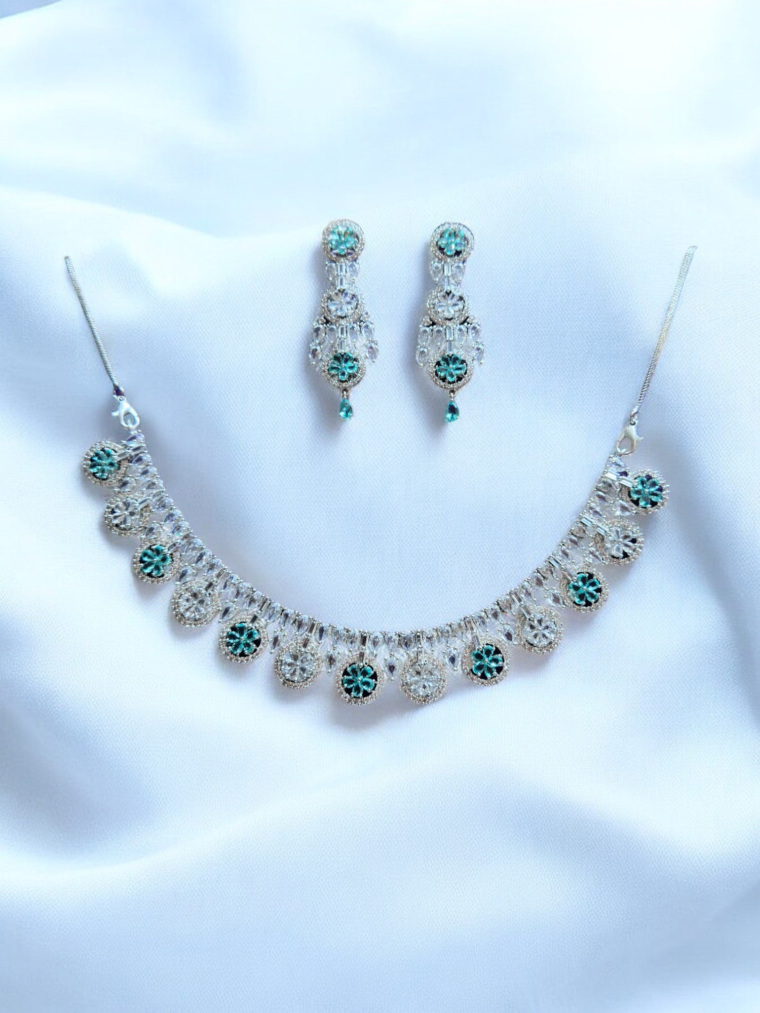 Elevate your style with this exquisite jewellery set featuring a necklace and matching earrings. Crafted with meticulous attention to detail, the set showcases a stunning array of sparkling crystals in a mesmerising colour & the depths. Each piece is elegantly designed with intricate metalwork, creating a captivating play of light and shadow. The necklace gracefully drapes around the neck, while the dazzling earrings add a touch of radiance to your look. Whether for a special occasion or an everyday ensemble, this jewellery set is sure to turn heads and leave a lasting impression. Indulge in its timeless beauty and elevate your confidence with every wear.