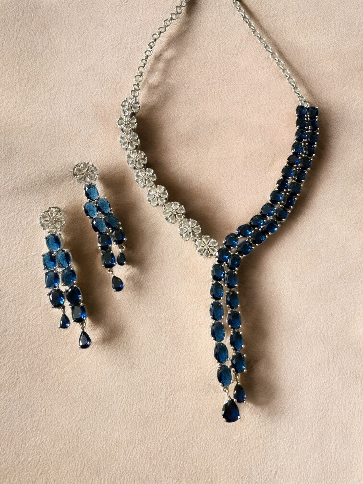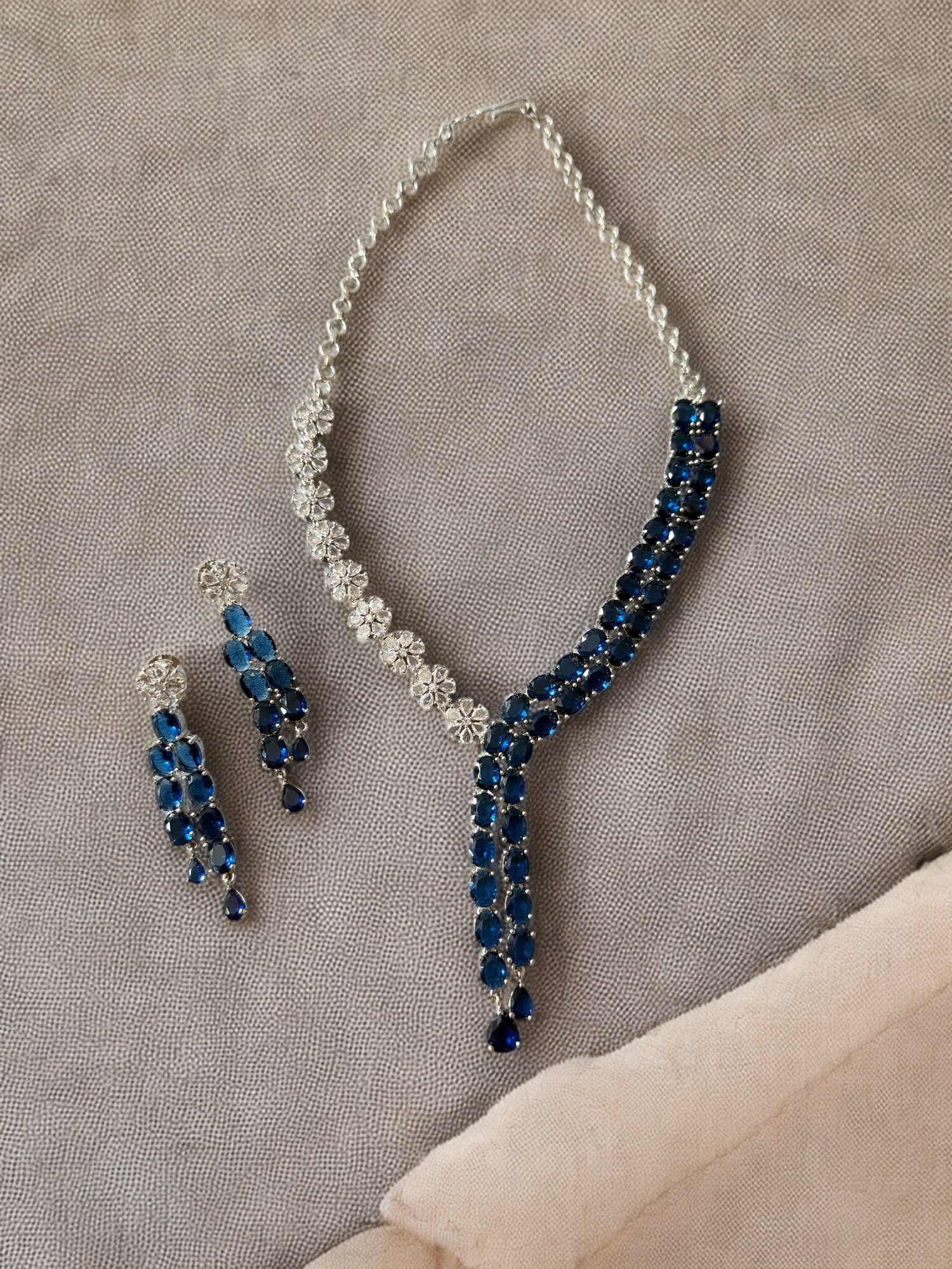 This necklace set features an elegant design with a striking combination of deep blue and clear stones. The necklace has an asymmetrical layout — one side is adorned with floral clusters of sparkling clear stones, while the other side showcases two cascading rows of oval-cut blue stones set in silver-toned metal. The centerpiece extends into a vertical drop that adds sophistication and elongates the neckline.