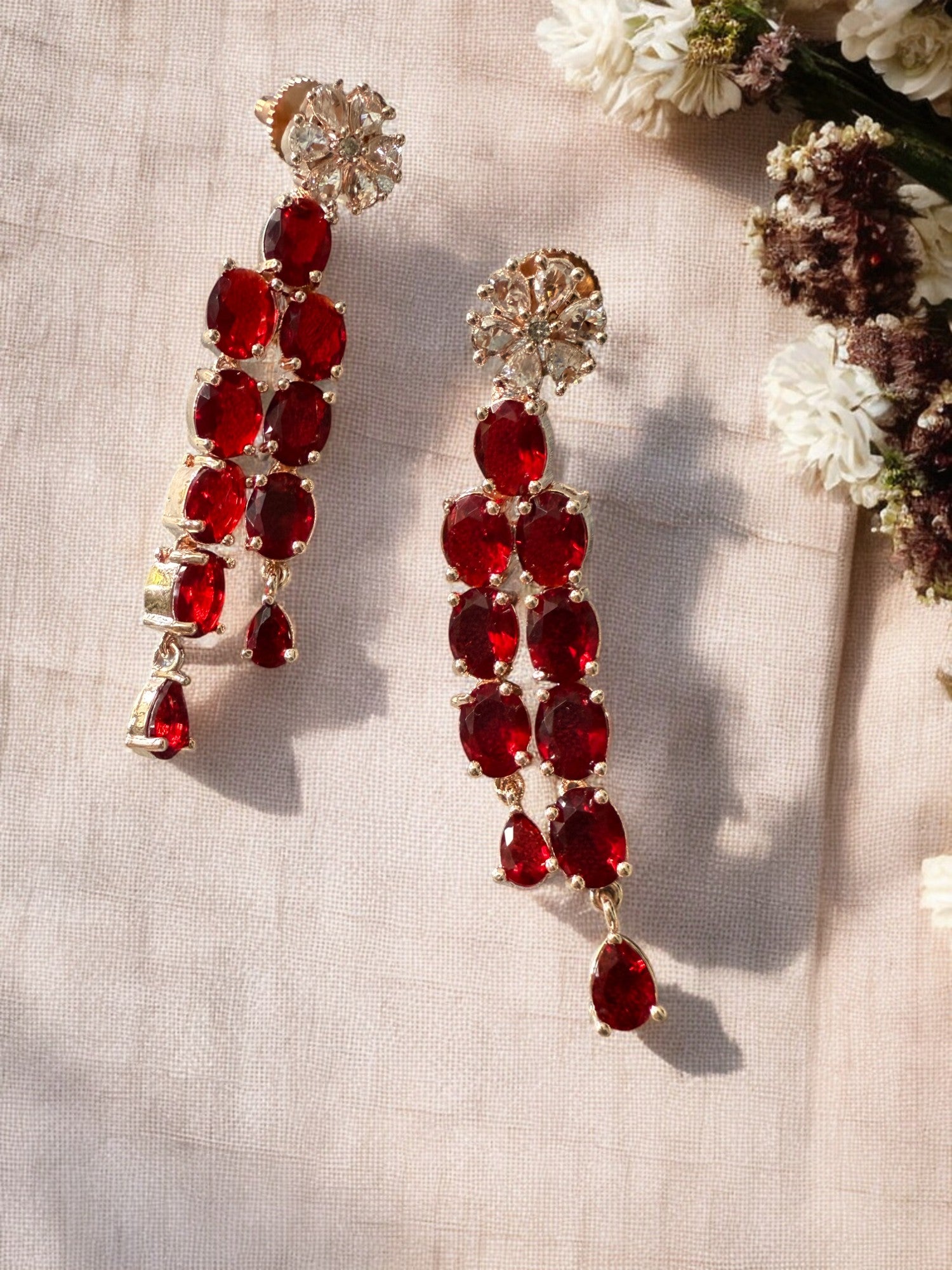 Matching earrings mirror the blue stone arrangement with a floral top stud and a vertical drop of multiple blue stones, ending in teardrop-shaped danglers. This set is ideal for formal occasions, evening wear, or weddings.