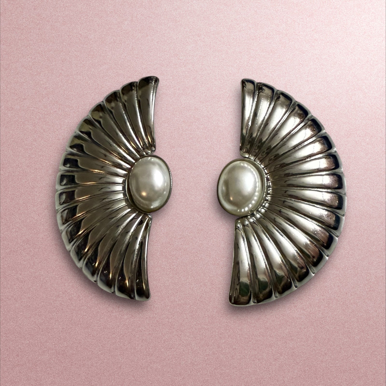 These stunning fan-shaped earrings feature a radiant silver-tone design with a central pearl accent, evoking vintage glamour with a modern twist. Perfect for adding sophistication to evening wear or making a bold statement in any outfit.