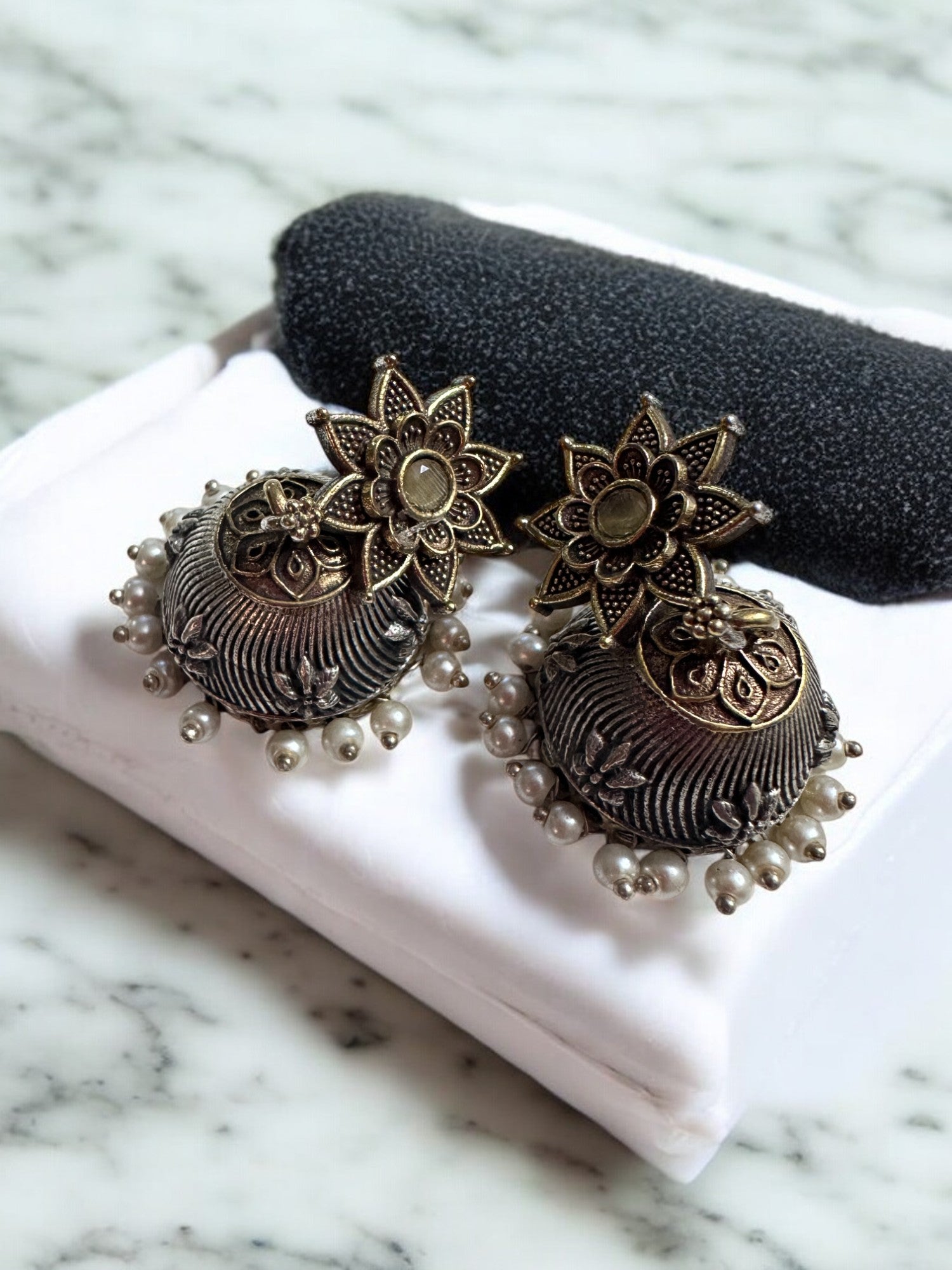 Vintage Style Oxidized Necklace and Earring Set with Yellow Stones, Pearl Clusters, Peacock Design